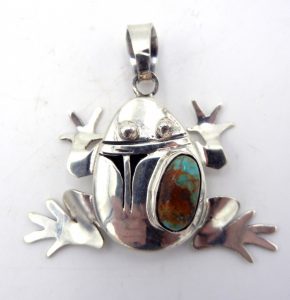 Specializing in kachina and animal pieces, Bennie says that the detail of his work requires a lot of patience, but that the end result is always worth it. His kachinas are drawn from actual dancers, which are then intricately detailed to match traditional designs within his pieces. His animal jewelry is often created in the shadowbox style, featuring cutouts within the silver and a three-dimensional effect.