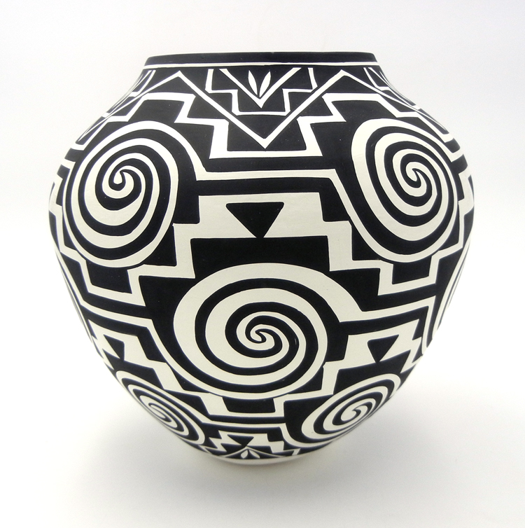 With matte on black designs, (i.e. liquid clay mixture painted over a polished surface), which are not nearly as intricate as other pueblo designs, the key element in determining value is the quality of the polish. High quality Santa Clara pottery has polish with very little variation on the surface. You should see small amounts of streaking or deviation in the black color on the surface of the pot. This