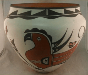 Mata Ortiz pottery often features brighter colors, including bright blues, than Pueblo pottery. The designs also differ, and they can look more modern. In the images below, you can see the difference between the first piece of pottery (a Mata Ortiz pot that features a parrot) and the second piece of pottery (a parrot on a piece of Acoma pottery):
