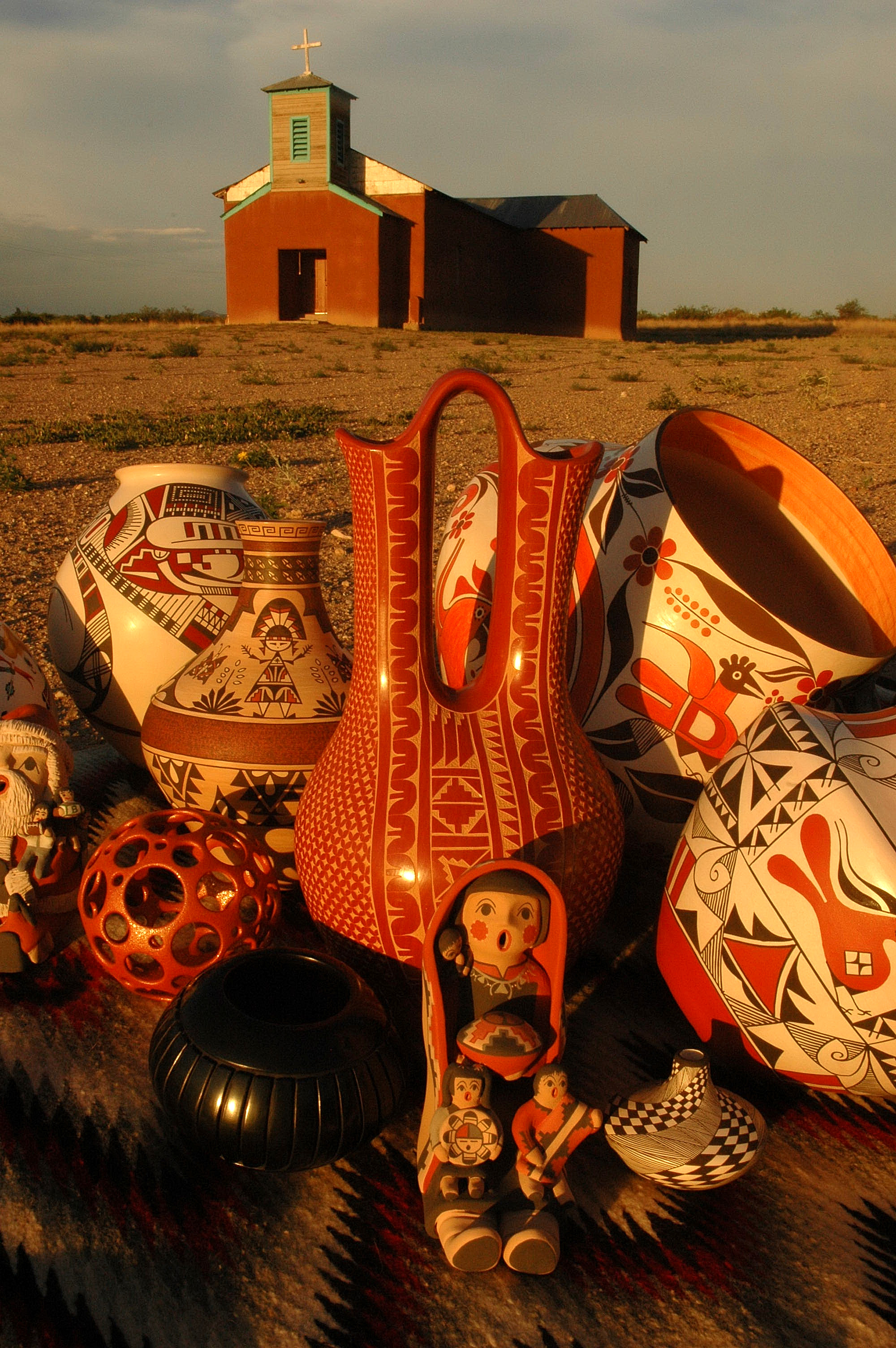 Jemez: Decorated after firing with intricate traditional patterns using either natural or commercial paints. Also make pottery in completely traditional ways, with native materials and techniques. Several Jemez artists have also perfected the art of incising/etching. Jemez potters are also known for storytellers.