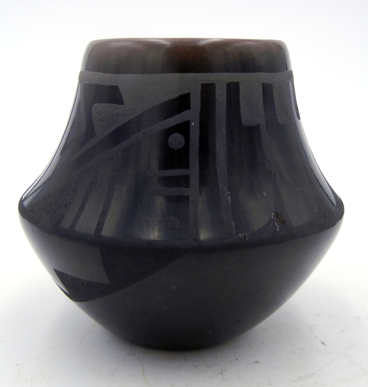 Santa Clara/San Ildefonso: Each makes black on black and red on red. Sometimes the contrast is obtained by combining a matte with a glossy finish. Other times, the designs are incised so the background stands out in relief. Decorations in contrasting colors are also used.