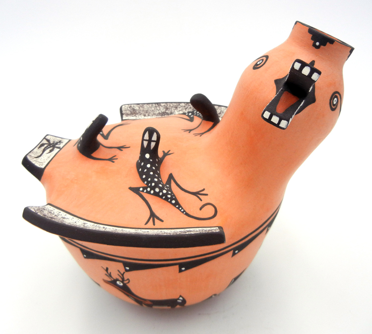 Cochiti: Known for pottery sculptures, figurines, and especially storytellers. The first storyteller originated at Cochiti Pueblo, by Helen Cordero. Cochiti is also known for vessels with clay animals attached to the usual shapes.