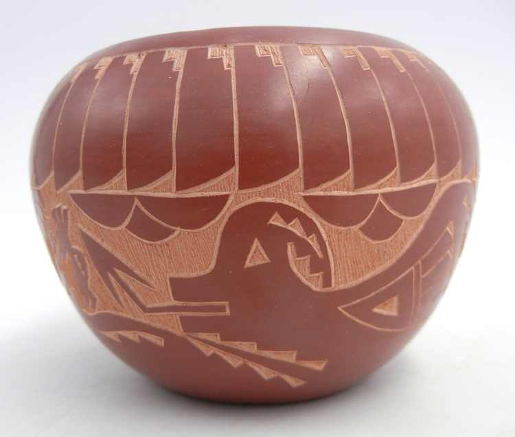 Like San Ildefonso Pueblo pottery, Santa Clara pottery artists created black-on-black and red vessels. Some pieces exhibit the same matte over glossy finish developed by Maria and Julian Martinez. But, Santa Clara Pueblo pottery artists have developed their own trademark styles and designs that distinguish their art from their neighbors’.
