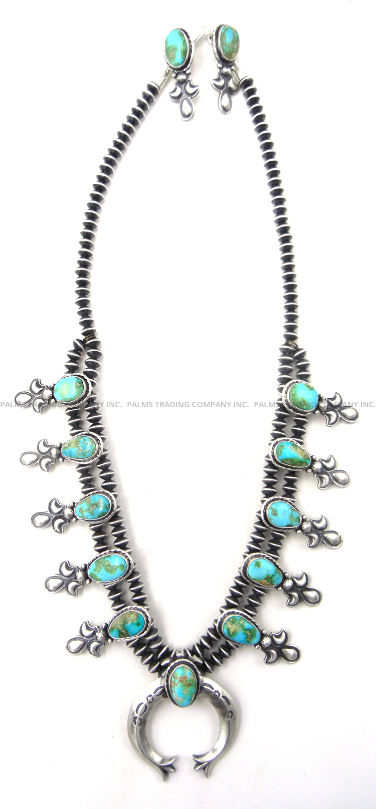 Navajo Lenora Garcia Small Turquoise and Sterling Silver Squash Blossom Necklace and Earring Set