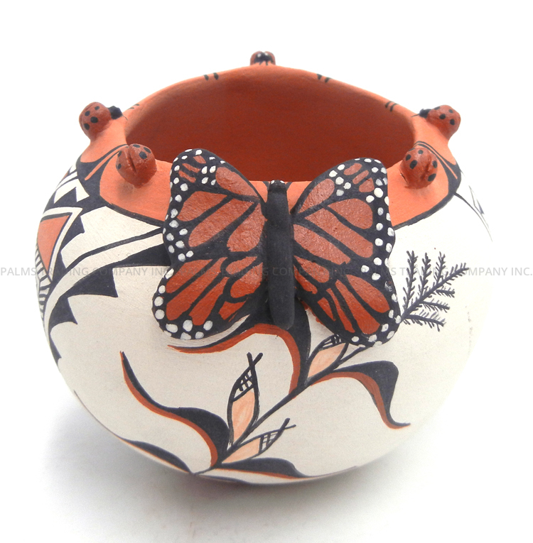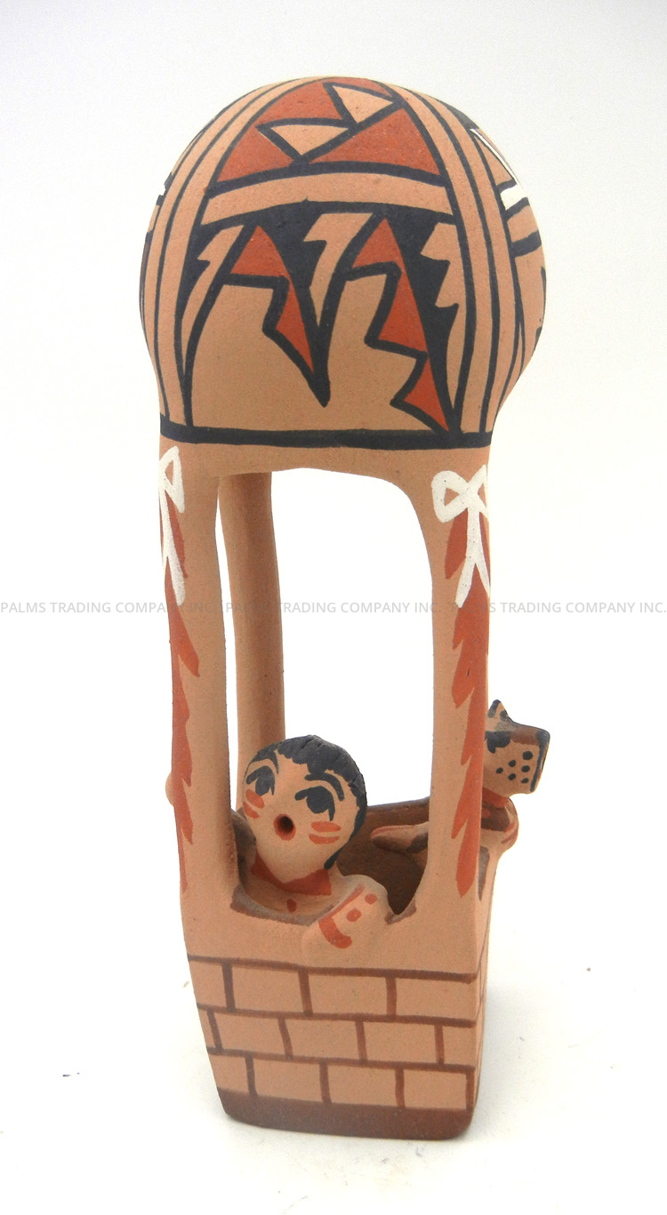 Palms Trading Company features Native American Indian pottery from Jemez pueblo that is unique to New Mexico. Many Pueblo nations feature wedding vases, seed pots, storytellers and kachinas, but only Jemez Pueblo artists create the Friendship Pot. These pots have clay people molded to the top as if looking in. Our Jemez Pueblo pottery often features the artwork of Kathleen Wall and Fannie Loretto, both local Jemez Pueblo artists who create contemporary pieces known for deviating from traditional vessels typically seen in Jemez pottery. Purchasing Jemez pottery from us guarantees you will receive authentic Native American Indian pottery because we buy directly from the artist.