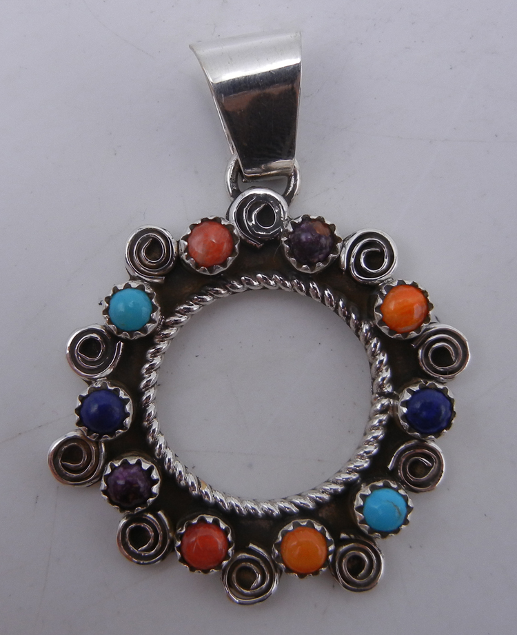 Navajo Turquoise, Coral and Sterling Silver Cluster Pendant