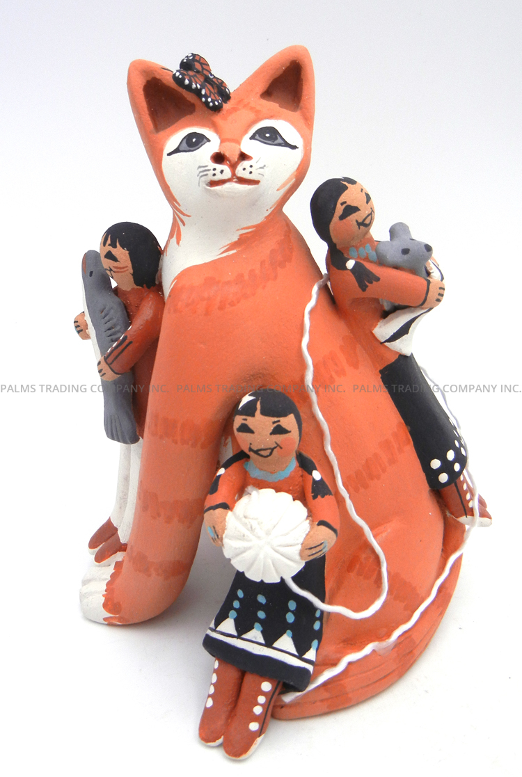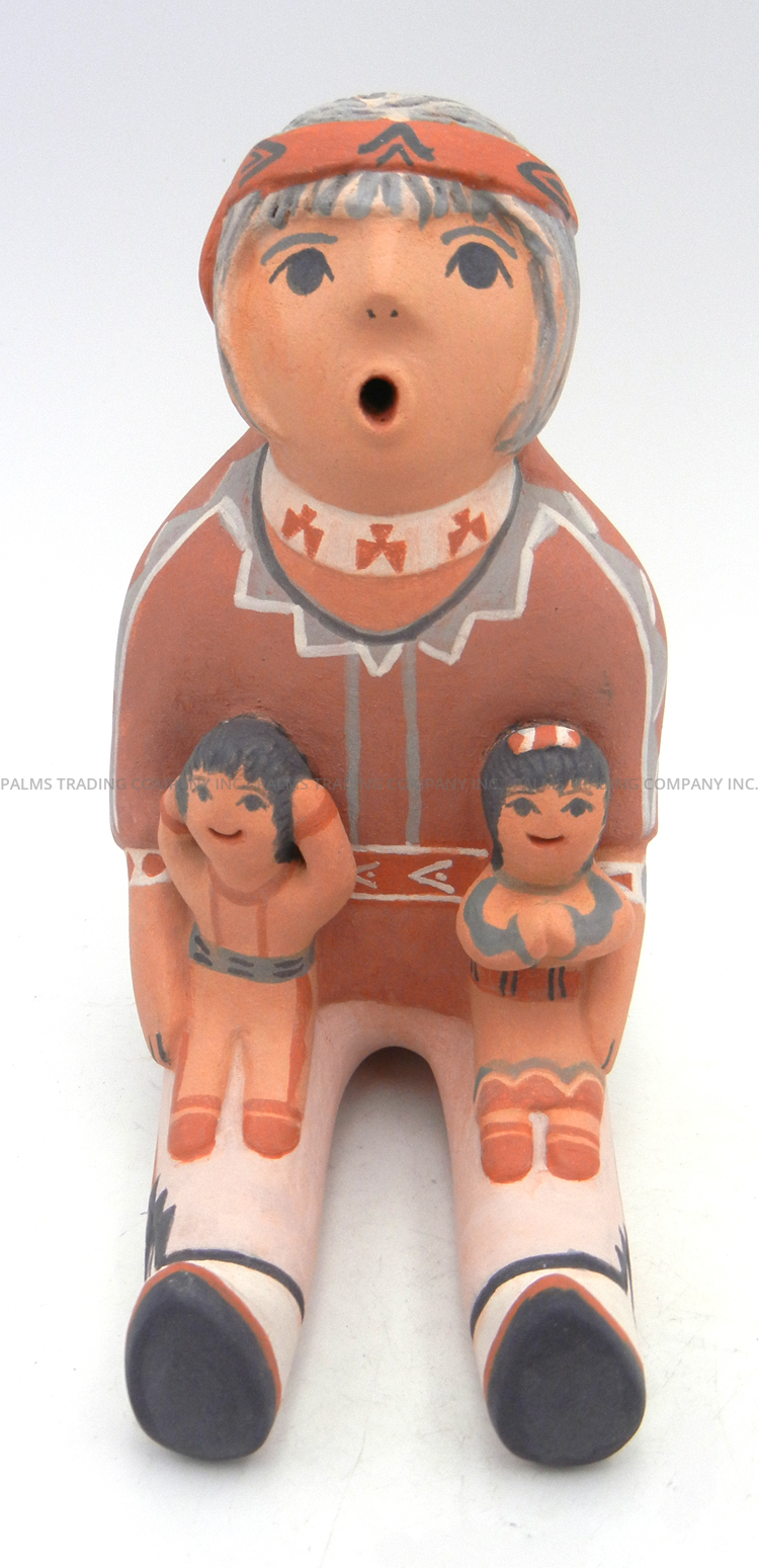 Palms Trading Company in Albuquerque, New Mexico recognizes the art of storytelling as an important part of Native American Indian traditions and cultures. The Jemez Pueblo Indians have possibly been the most prolific when it comes to making this kind of Native American Indian art, with some characteristics of their pottery integrating with each storyteller piece such as the clay-slip color scheme. Jemez Pueblo Indians have deviated from traditional figures when making their storytellers and sometimes even borrow more contemporary characters from mainstream culture such as Santa Claus and elves. Collecting storytellers from our company guarantees you are receiving an authentic, handcrafted item steeped in Native American Indian tradition.