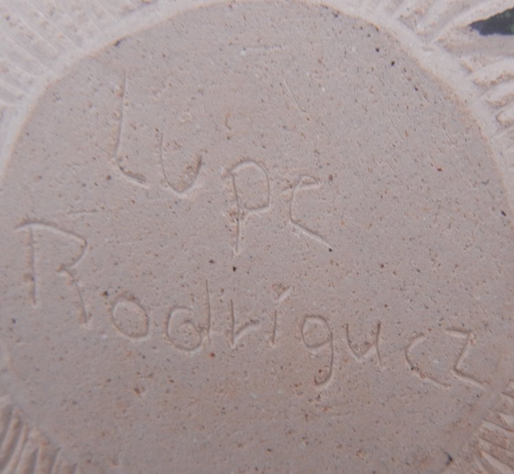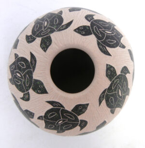 A cream, etched backdrop is accented with multiple etched sea turtles in this fun, small bowl by Mata Ortiz potter Lupe Rodriguez. Each turtle is painted green and appears to be swimming upward to the opening of the bowl. 3 1/2″ tall x 3 1/2″ wide.