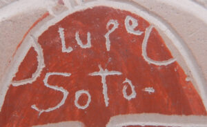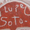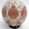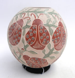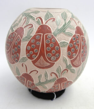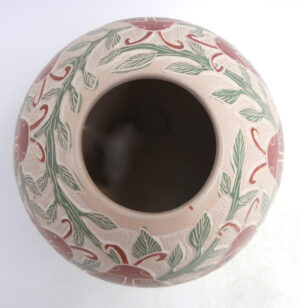 Showcasing an etched, buff backdrop, this fun jar by Mata Ortiz potter Lupe Soto features ladybugs climbing upon greenery accented by leaves. The red and black ladybugs appear in two rows around the jar, while branches and leaves extend upward and around painted in green. 7″ tall x 6″ wide.