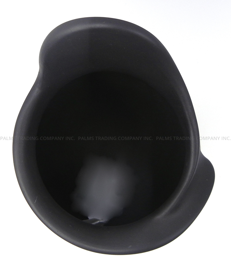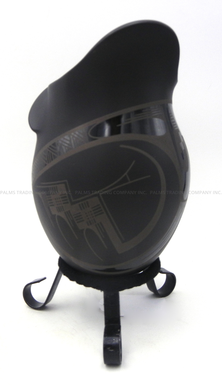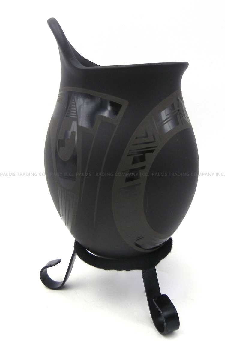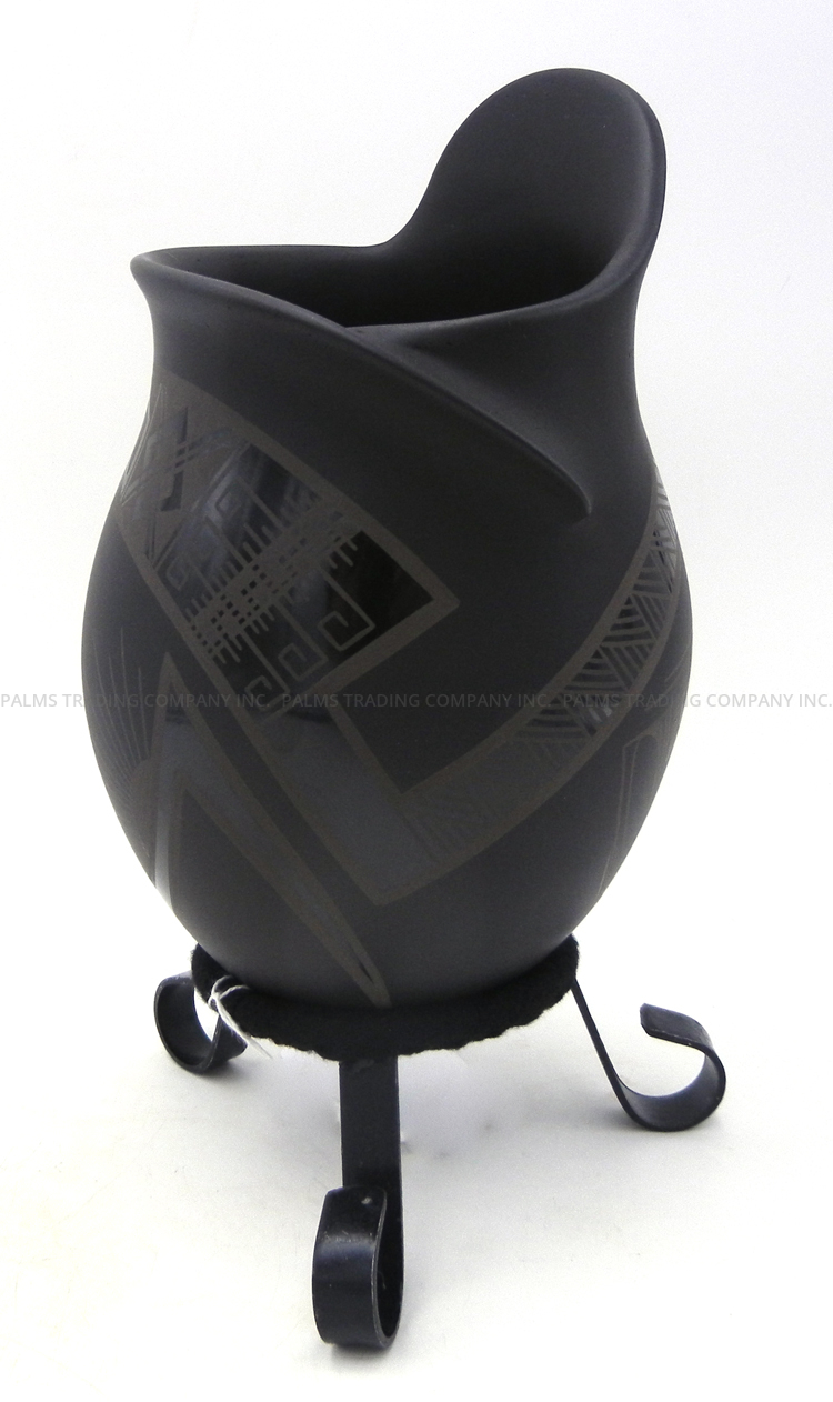 Showcasing beautifully painted geometric designs interspersed with a high shine polish, this incredible vase was handmade by Mata Ortiz potter Lydia Quezada.  The piece features a unique and contemporary offset, swirling rim, while its black body is painted in black with various geometric patterns as well as a sun.  Painted patterns are offset by a gorgeous polish, finishing the piece beautifully.  10″ tall including stand x 5″ wide.  8 1/2″ tall without stand.