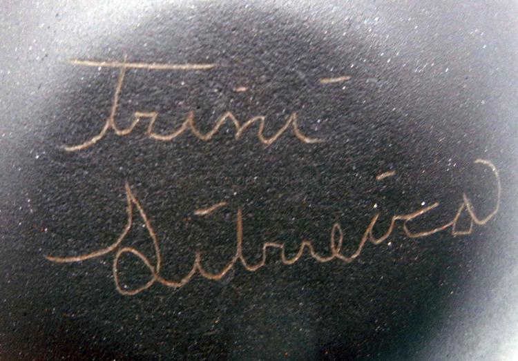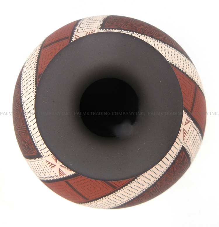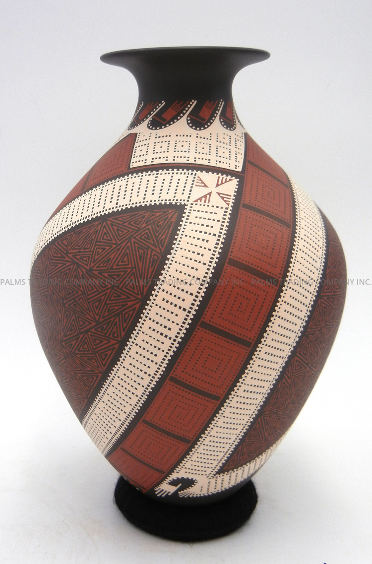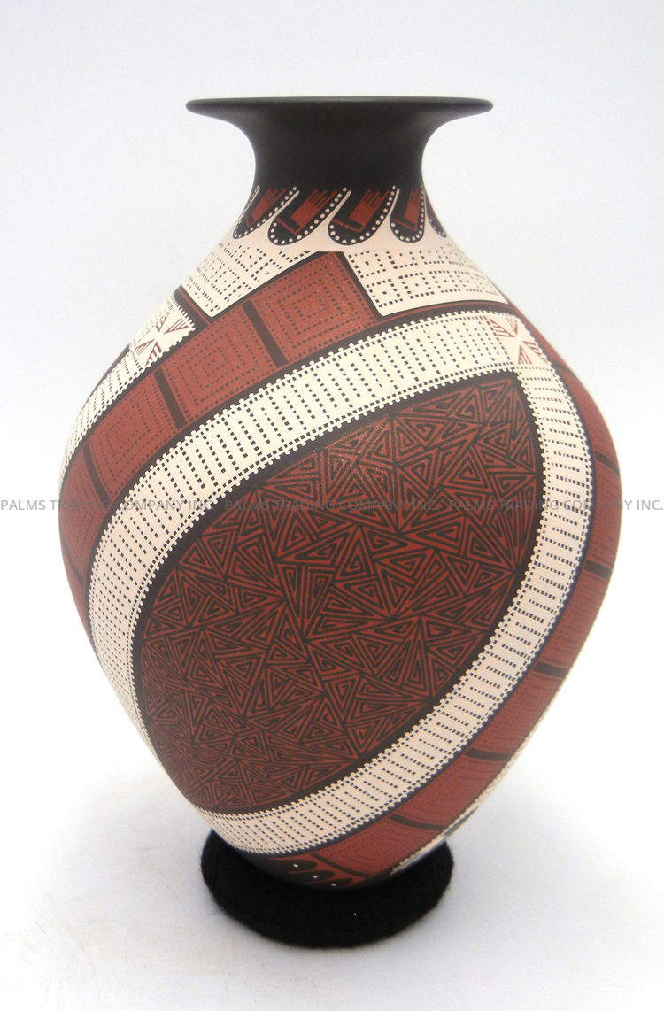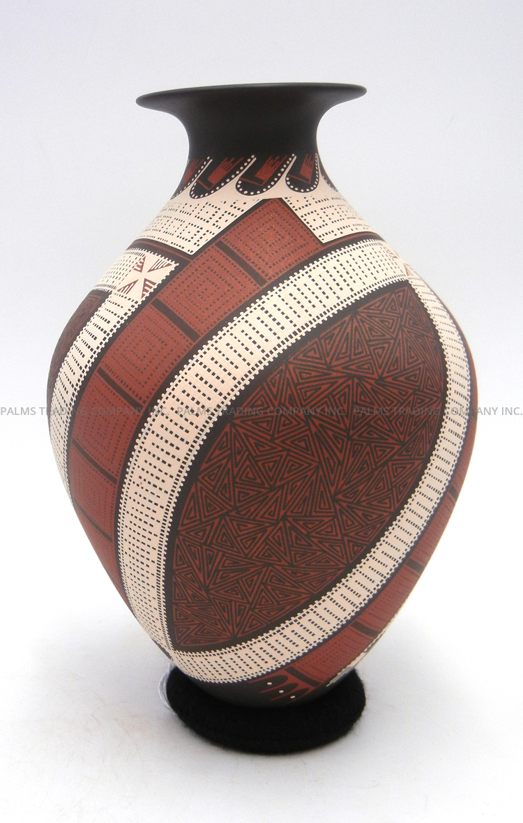 Intricately and beautifully painted by  hand in several impossibly small and accurate patterns, this impressive vase was handmade by Mata Ortiz potter Trini Silveira.  The piece is painted in two different red tones, white and black, with the rim and a portion of the neck painted entirely black, giving way to wonderfully intricate patterns mostly consisting of tiny squares and fine lines.  Patterns are painted on diagonals, the white standing out beautifully against the red and black, the piece mesmerizing to look at. 7 3/4″ tall without ring x 5″ wide.  8″ tall with ring.