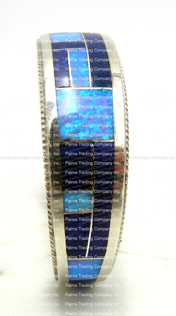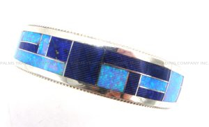 Zuni silversmiths and husband and wife team Rickel and Glenora Booqua combined lapis, lab opal and sterling silver to create this stunning cuff bracelet. Stones are inlaid along a sterling silver shank from end to end, separated into geometric patterns by inlaid slivers of sterling silver. Edges of the cuff are finished with thin sterling silver rope patterns. 5/8″ wide with an inner end to end measurement of 5 1/4″ and a 1 1/8″ opening. Cuff is NOT adjustable.
