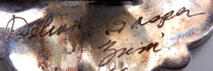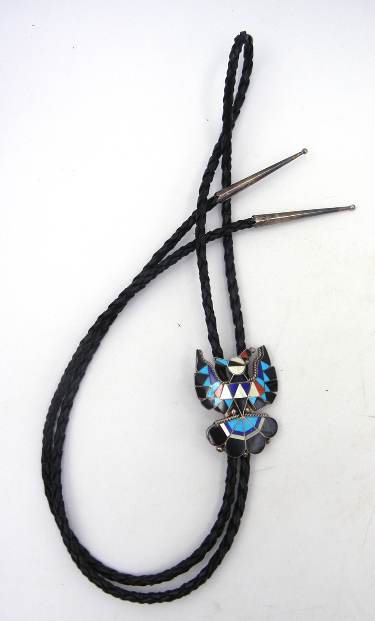 Turquoise, coral, lapis, jet and white mother of pearl combine to form a traditional inlay thunderbird in this impressive bolo tie by Zuni silversmith Delwin Gasper. The thunderbird’s body faces forward, wings outstretched and head on a profile, with the head inlaid in white mother of pearl and jet and featuring a turquoise beak and coral and jet feather atop its head. Each of the thunderbird’s outstretched wings is inlaid in geometric patterns in jet, turquoise, coral, white mother of pearl and lapis, while its triangular body features white mother of pearl, jet and turquoise. Tail feathers are inlaid in turquoise, coral, lapis, white mother of pearl and jet, with sterling rope patterns accenting the top of the wings and sterling dots finishing the tail feathers, body and head. Additional inlay is showcased at the bottom of each sterling silver tip, with panels mimicking the bird’s tail feathers above and inlaid in the same stones. 2 1/2″ long x 2″ wide. Bolo measures 24″ from top to bottom.