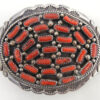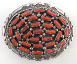 A cluster of multiple beautiful red coral pieces rests at the center of this traditional Navajo belt buckle. Each stone is set in a sawtooth sterling silver bezel and separated by one or multiple applique sterling dots. The cluster of coral is encased by a thin sterling rope pattern, followed by a sterling band stamped with scallop patterns and curved lines. 3″ long x 2 1/2″ wide. Fits belt size 1 5/8″.