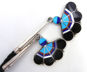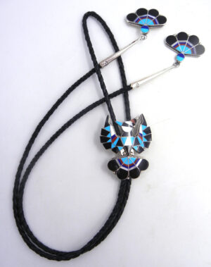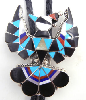 Turquoise, coral, lapis, jet and white mother of pearl combine to form a traditional inlay thunderbird in this impressive bolo tie by Zuni silversmith Delwin Gasper. The thunderbird’s body faces forward, wings outstretched and head on a profile, with the head inlaid in white mother of pearl and jet and featuring a turquoise beak and coral and jet feather atop its head. Each of the thunderbird’s outstretched wings is inlaid in geometric patterns in jet, turquoise, coral, white mother of pearl and lapis, while its triangular body features white mother of pearl, jet and turquoise. Tail feathers are inlaid in turquoise, coral, lapis, white mother of pearl and jet, with sterling rope patterns accenting the top of the wings and sterling dots finishing the tail feathers, body and head. Additional inlay is showcased at the bottom of each sterling silver tip, with panels mimicking the bird’s tail feathers above and inlaid in the same stones. 2 1/2″ long x 2″ wide. Bolo measures 24″ from top to bottom.