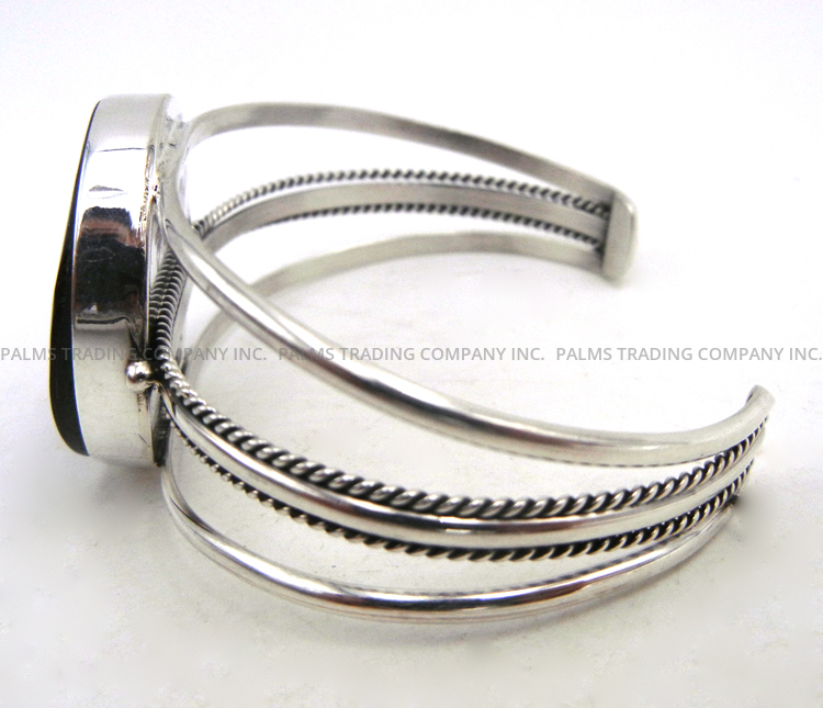 A single, round piece of stunning iridescent and varying abalone is set as the focal point of this traditional Navajo cuff bracelet.  The stone is set in a simple sterling silver bezel atop a split sterling silver shank, the center split of which is bordered on top and bottom by thin sterling silver rope patterns.  Shank merges at each end.  1 1/4″ wide with an inner end to end measurement of 5 3/8″ and a 1 3/8″ opening.  Cuff is somewhat adjustable.