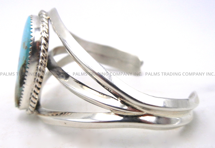A single piece of gorgeous light blue turquoise containing portions of brown matrix concentrated on one end rests atop a thrice split sterling silver shank in this lovely cuff bracelet by Navajo silversmith Elroy Chavez.  The stone is set in a sawtooth sterling silver bezel and surrounded at the base by a sterling silver rope pattern.  Shank merges about halfway toward each end. 1 1/2″ wide with an inner end to end measurement of 5″ and a 1 3/8″ opening.  Cuff is somewhat adjustable.