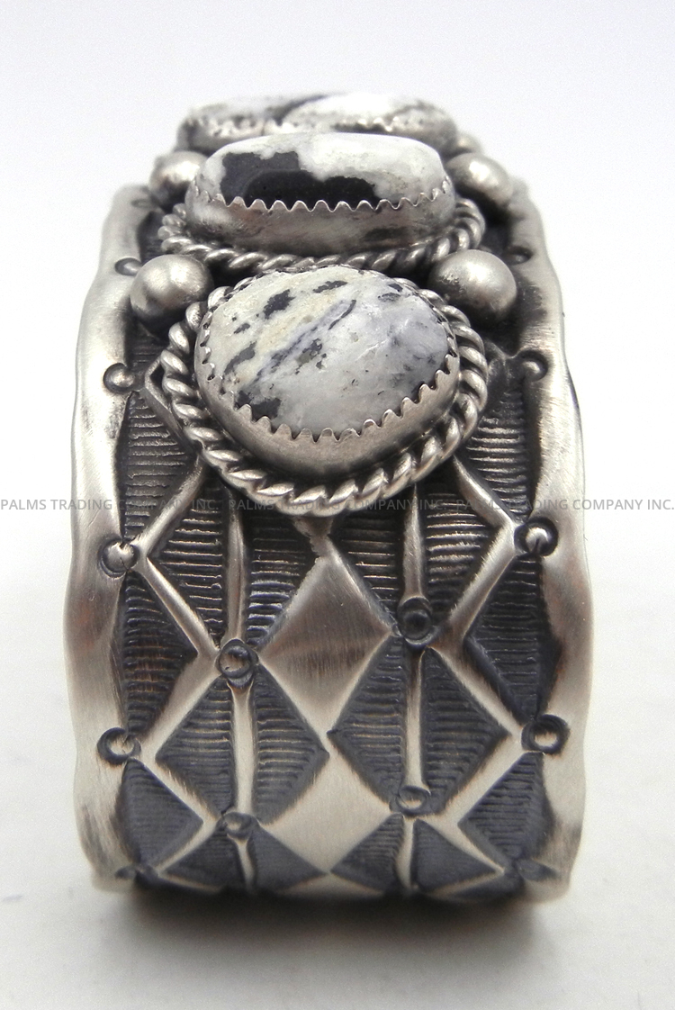 Five White Buffalo stones sit in a single row along a wide, detailed sterling silver shank in this traditional cuff bracelet by Navajo silversmith Elroy Chavez. Each stone is set in a sawtooth sterling silver bezel and surrounded at the base by a sterling silver rope pattern, while the stones are separated from one another on top and bottom along the shank by applique sterling dots.  The remainder of the shank showcases stamped diamond, triangle and dot designs extending to each end.  1 1/8″ wide with an inner end to end measurement of 5 1/2″ and a 1 1/2″ opening.  Cuff is not adjustable.