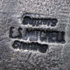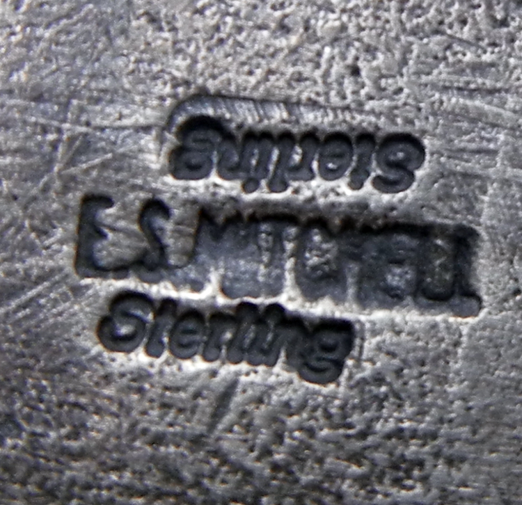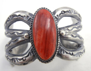 A flowing, sandcast brushed and stamped sterling silver shank is accented at the center with a single, oval red spiny oyster piece in this impressive cuff bracelet by Navajo silversmith Eugene Mitchell.  The stone is set in a simple sterling silver bezel and surrounded at the base by a thin sterling silver rope pattern, while it’s bordered at the center on each side of the shank by a single, applique sterling dot.  shank is stamped with scallop, dot and triangle patterns.  1 3/8″ wide with an inner end to end measurement of 5″ and a 1 1/4″ opening.  Due to its density, cuff is not adjustable.