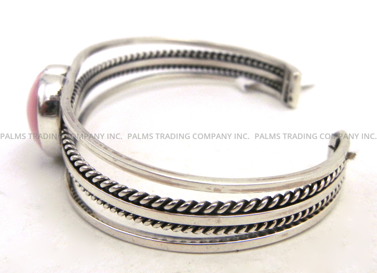 A single piece of pink conch shaped to form a heart rests atop a split sterling silver shank in this lovely Navajo cuff bracelet. The stone is set in a simple sterling silver shank, while the center split of the shank is bordered on top and bottom by thin sterling rope patterns. Shank merges at each end. 5/8″ wide with an inner end to end measurement 5 3/8″ and 1″ opening. Cuff is somewhat adjustable.