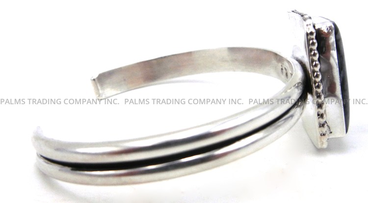 A rectangular piece of White Buffalo rests atop a thin, soldered sterling silver shank in this traditional cuff bracelet by Navajo silversmith Rosella Paxon.  The stone, showcasing mostly black matrix with hints of white, is set in a simple sterling silver bezel and surrounded at the base by a row of sterling dots.  Stone and silverwork rest atop a soldered sterling shank featuring two thin bands.  1″ wide with an inner end to end measurement of 5 1/2″ and a 1 3/8″ opening.  Cuff is somewhat adjustable.