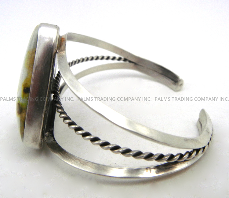 A single, rounded triangular piece of light blue-green Sonoran Gold turquoise creates the focal point of this gorgeous Navajo cuff bracelet.  The stone, which also contains portions of brown matrix, is set in a simple sterling silver bezel and set at the center top of a thrice split sterling silver shank, the center of which comprises a sterling silver rope pattern. Shank merges 3/4 of the way toward each end.  1 3/8″ wide with an inner end to end measurement of 5 1/2″ and a 7/8″ opening.  Cuff is somewhat adjustable.