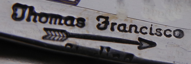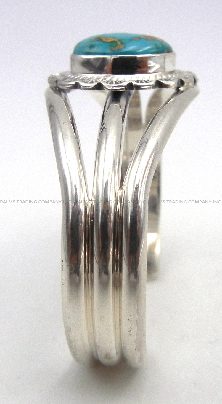 A single piece of stunning blue-green Royston turquoise surrounded by sterling silver rests at the center of a thrice split sterling silver shank in this wonderful handmade cuff bracelet by Navajo silversmith Thomas Francisco.  The stone, set in a simple sterling silver bezel, contains portions of tan matrix running throughout.  It is surrounded at the base by a sterling silver rope pattern, followed by a thin, scallop edged sterling silver band stamped with scallop designs.  Shank merges about halfway toward each end. 1 1/8″ wide with an inner end to end measurement of 5 5/8″ and a 1″ opening.  Cuff is slightly adjustable.