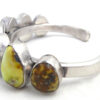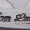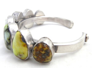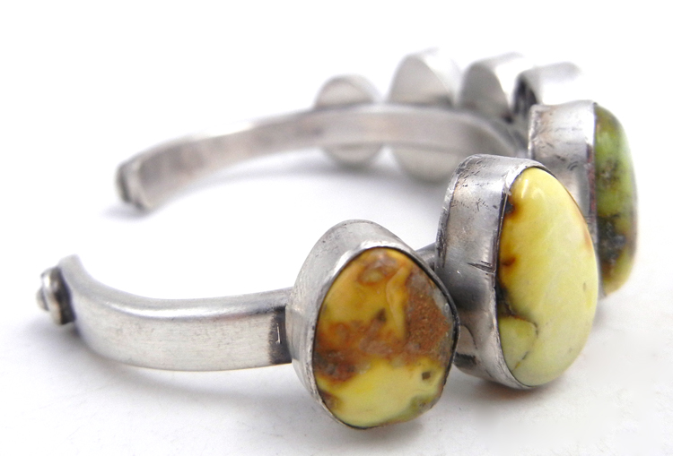Seven pieces of green-leaning Palomino turquoise pieces rest on a narrow, simple sterling silver shank in this eye-catching cuff bracelet by Navajo silversmith Tom Lewis.  Each stone is set in a simple sterling silver bezel, with most stones containing portions of brown matrix, and stones decreasing in size toward each end of the cuff.  Ends of the shank are finished with applique circles and dots.  3/4″ wide with an inner end to end measurement of 5 1/8″ and a 1″ opening.  Cuff is not adjustable.