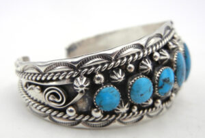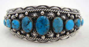 Nine turquoise stones graduating larger in size and converting from circles to ovals line the center of this intricate Navajo cuff bracelet. Each stone is set in a sawtooth sterling silver bezel and contains portions of dark brown matrix. The stones are separated on top and bottom by applique sterling star patterns which alternate with applique dots, while sterling rope patterns line all sides of the cuff, followed by sterling bands stamped with reoccurring scallop designs. 1″ wide with an inner end to end measurement of 5 1/2″ and a 1 1/16″ opening. Cuff is very slightly adjustable.