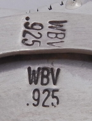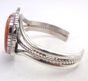 A single, large piece of red spiny oyster cut to form a heart creates the focal point of this eye-catching cuff bracelet by Navajo silversmith Walter Vandever.  The stone is set in a notched sterling silver bezel and surrounded by a row of domed. thin sterling silver bands, followed by a sterling panel showcasing notches like those along the bezel. Stone and silverwork are set on a thrice split sterling silver shank, the center of which comprises a sterling silver rope pattern.  1 1/2″ wide with an inner end to end measurement of 5 1/2″ and a 1 1/4″ opening.