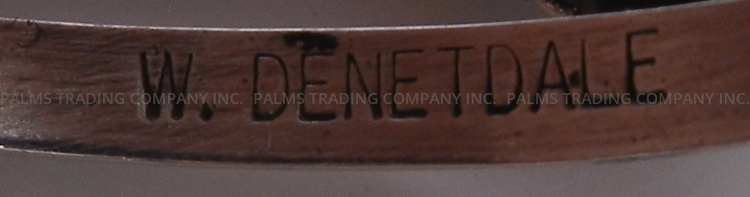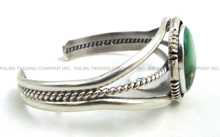 A single, unique green turquoise stone rests atop a thrice split sterling silver shank and is surrounded by sterling silver accents in this traditional cuff bracelet by Navajo silversmith Will Denetdale.  The stone is set in a simple sterling silver bezel, varies light to deep green in color, and is surrounded at the base by a stamped sterling band.  The piece’s shank features a sterling silver rope pattern at its center, the three splits merging about halfway toward each end.  1″ wide with an inner end to end measurement of 5 1/8″ and a 1″ opening. Cuff is somewhat adjustable.