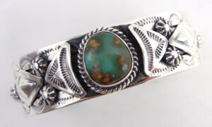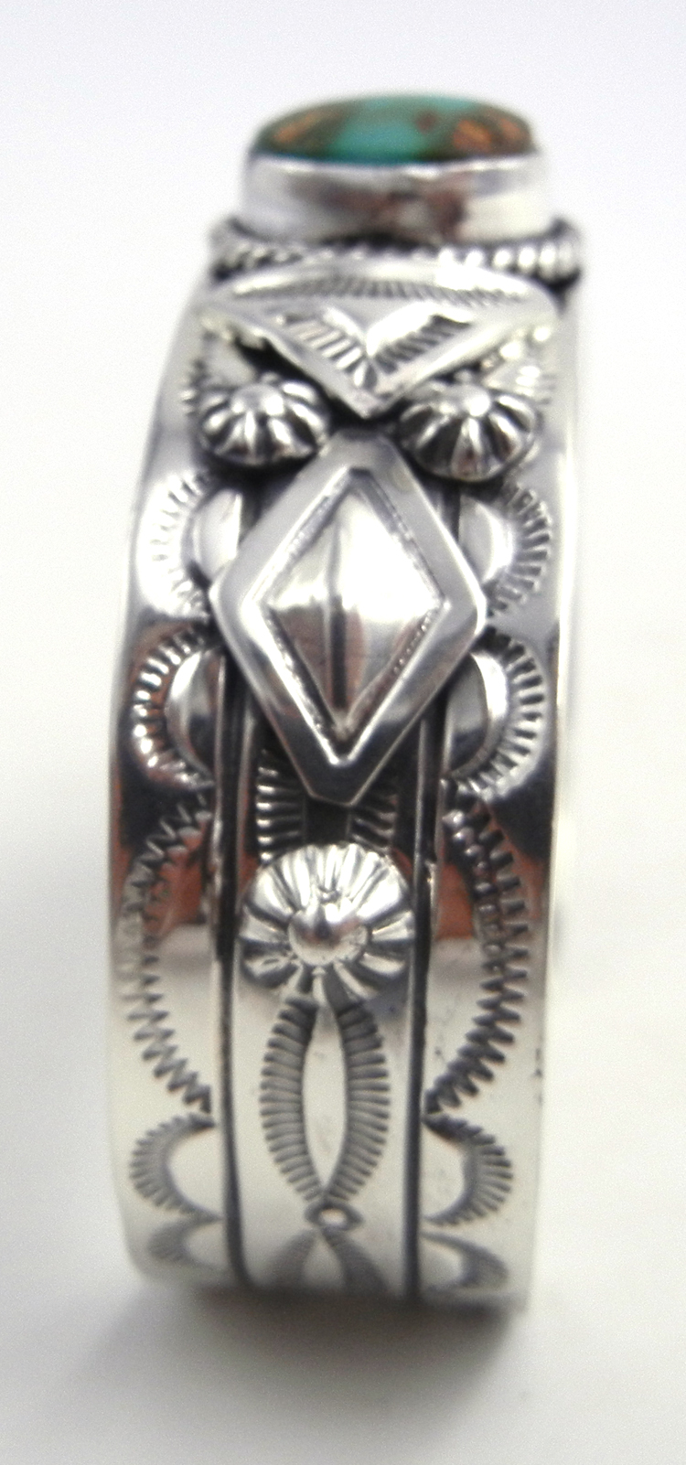 A solid sterling silver band showcasing intricate applique and stamp work is set at the center with a single piece of green turquoise containing portions of brown and tan matrix in this impressive cuff bracelet by Navajo silversmith Will Denetdale.  The stone is set in a simple sterling silver bezel and surrounded at the base by a sterling silver rope pattern, while the shank of the piece is stamped with scallop designs and set with various applique designs, including repousse diamonds, triangles, and star patterns.  3/4″ wide with an inner end to end measurement of 5 1/4″ and a 7/8″ opening.  Cuff is slightly adjustable.