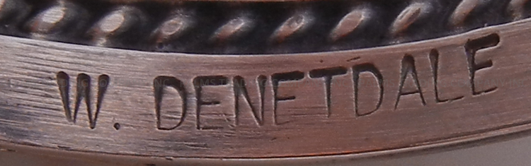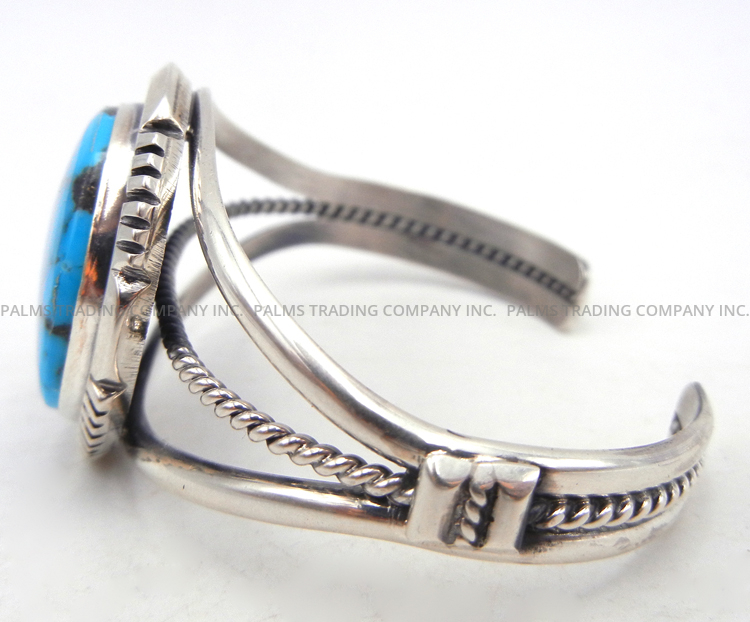 A single, bright blue turquoise stone creates the focal point of this traditional cuff  bracelet by Navajo silversmith Will Denetdale.  The stone, which contains portions of brown matrix running throughout, is set in a simple sterling silver bezel and surrounded at the base by a sterling band stamped and cut out to form a pattern. Stone and silverwork are set atop a thrice split sterling silver shank, the center of which comprises a sterling silver rope pattern.  Shank merges about halfway toward each end, the merge point featuring an applique sterling rectangle traversed by a short sterling rope pattern.  1 3/8″ wide with an inner end to end measurement of 5 1/8″ and a 1″ opening.  Cuff is slightly adjustable.