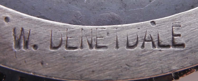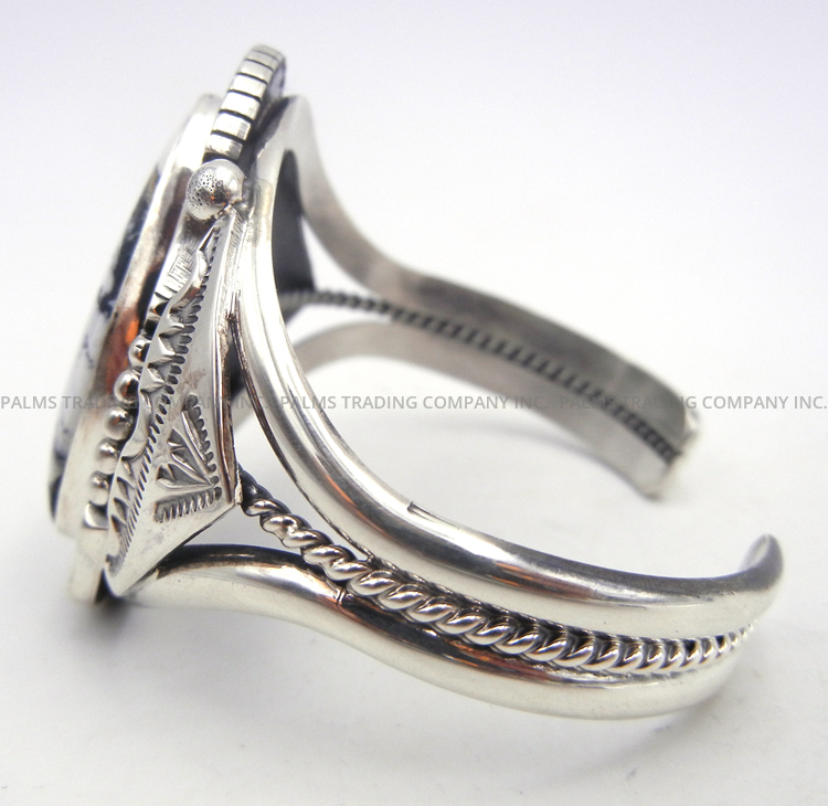 A large, tear drop shaped piece of gorgeous White Buffalo is surrounded by detailed and intricate sterling silverwork in this impressive cuff bracelet by Navajo silversmith Will Denetdale.  The stone, containing portions of black matrix running throughout, is set in a simple sterling silver bezel and surrounded at the base by a row of thin, domed sterling silver bands.  This, in turn, is surrounded by a sterling silver panel stamped and cut out to form a reoccurring pattern, as well as set with two rows of five applique sterling dots each.  Stone and silverwork are set atop a split sterling silver shank, the center of which comprises a thin sterling silver rope pattern, while each side of the stone along the shank is set with a triangular sterling silver panel stamped with triangle and scallop designs. Shank merges about halfway toward each end.  1 7/8″
