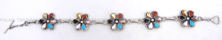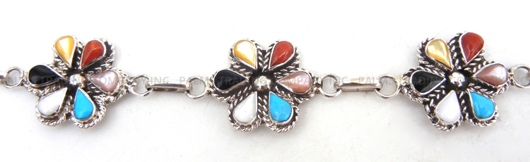 Turquoise, coral, jet, white mother of pearl and pink mussel shell combine with sterling silver in five floral patterns to form this gorgeous Zuni link bracelet.  The petals of each flower are inlaid with one of each of the aforementioned stones, all stones tear drop shaped and surrounding a round sterling silver dot.  Each of the stones is surrounded at the base by a sterling silver rope pattern, and floral patterns are connected by sterling silver jump rings.  Bracelet is finished with a bar clasp. 8 1/2″ from end to end x 3/4″ wide.