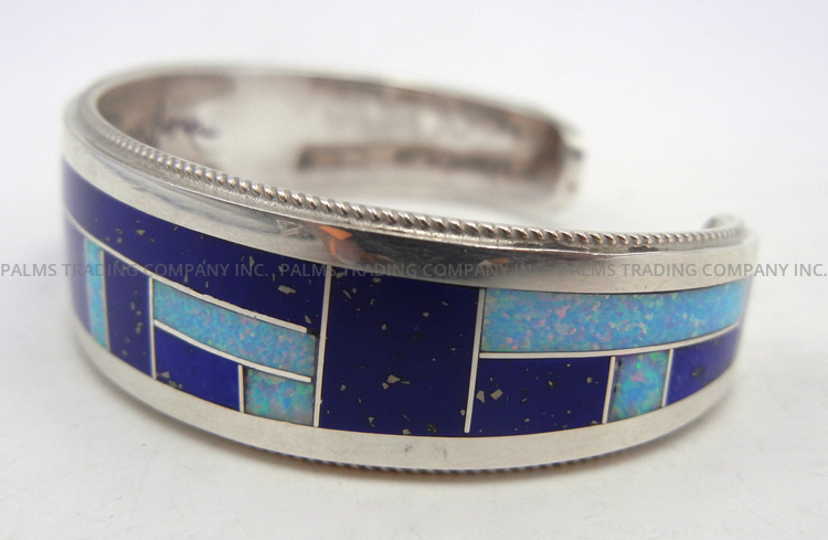 Zuni silversmiths and husband and wife team Rickel and Glenora Booqua combined lapis, lab opal and sterling silver to create this stunning cuff bracelet. Stones are inlaid along a sterling silver shank from end to end, separated into geometric patterns by inlaid slivers of sterling silver. Edges of the cuff are finished with thin sterling silver rope patterns. 5/8″ wide with an inner end to end measurement of 5 1/4″ and a 1 1/8″ opening. Cuff is NOT adjustable.