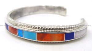 Red and orange spiny oyster, turquoise, lapis, and lab opal combine with vertically set slivers of sterling silver to form traditional channel inlay along a sterling silver shank in this gorgeous cuff bracelet by Zuni silversmith Ricky Booqua.  The stones create both long and short rectangles along the piece’s shank, while the edges of the cuff feature sterling silver rope patterns.  Inlay work extends from end to end.  1/4″ wide with an inner end to end measurement of 5 1/4″ and a 1 1/8″ opening. Cuff is NOT adjustable.