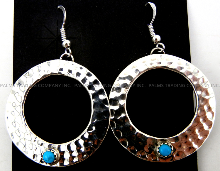 Circular, hammered sterling silver panels featuring a circular cut out at the center are set with a single, small round turquoise piece in these contemporary earrings by Navajo silversmith Pauline Nelson. Each stone is set bottom center in a sawtooth sterling silver bezel. 2 1/8″ long including French hook x 1 3/8″ wide.