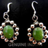 Small, oval pieces of green turquoise are surrounded by applique sterling dots and star patterns in these unique Navajo dangle earrings.  Each stone is set in a sawtooth sterling silver bezel and contains hints of golden matrix. 1 3/8″ long including French hook x 1/2″ wide.