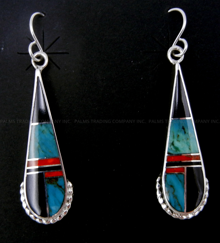 Turquoise, jet, coral and sterling silver combine in geometric inlay within a tear drop shaped sterling silver bezel in these unique dangle earrings by Navajo silversmith Stanley Manygoats. Each simple bezel features each of the aforementioned stones inlaid along with slivers of sterling silver, the silver separating the stones into various shapes. Each earring is finished with a curve of applique sterling dots along the bottom. 2 1/8″ long x 1/2″ wide.