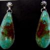 Large, tear drop shaped turquoise pieces hang from sterling silver star pattern posts in these traditional dangle earrings by Navajo silversmith Will Denetdale. Each stone is green in color and contains portions of brown matrix concentrated on one side toward the center, while stones are set in simple sterling silver bezels. 1 7/8″ long x 5/8″ wide. Earrings are post.