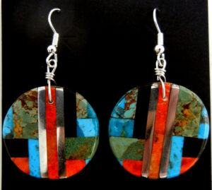 Blue and green turquoise, apple coral, red spiny oyster shell, jet and sterling silver combine in beautiful geometric inlay atop round abalone pieces in these fun, contemporary slab earrings by Santo Domingo silversmith Daniel Coriz.  All stones, along with sterling silver, are cut into rectangular and square shapes and inlaid in a lovely, tight mosaic.  1 7/8″ long including French hook x 1 1/8″ wide.