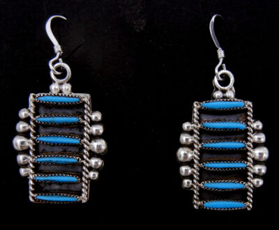 A circular sterling silver panel cut out at the top with an additional circle hangs and inlaid with golden mother of pearl and sterling silver hangs from a round post also featuring inlaid golden mother of pearl in these gorgeous Zuni earrings.  Each post features only golden mother of pearl in a simple sterling silver bezel, while curved sterling silver slivers great additional geometric patterns within each dangle.  1 1/2″ long x 3/4″ wide. Earrings are post.