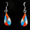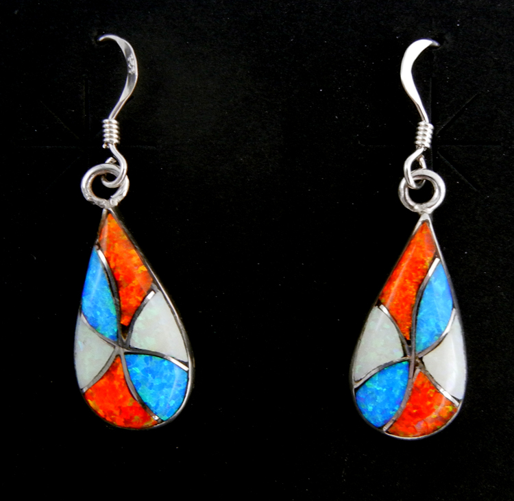 White, blue and orange slab opal combine with curved slivers of sterling silver in beautiful inlay in these eye-catching earrings by Zuni silversmith Orlinda Natewa. Inlay work is set in simple sterling silver bezels and sterling slivers cut through the inlay work, creating additional geometric designs. 1 3/8″ long including French hook x 3/8″ wide.