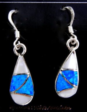 Tear drop shaped simple sterling silver bezels are inlaid with white mother of pearl, blue lab opal and curved slivers of sterling silver in Zuni silversmith Orlinda Natewa’s signature fish scale style in these traditional earrings.  1 1/4″ long including French hook x 3/8″ wide.