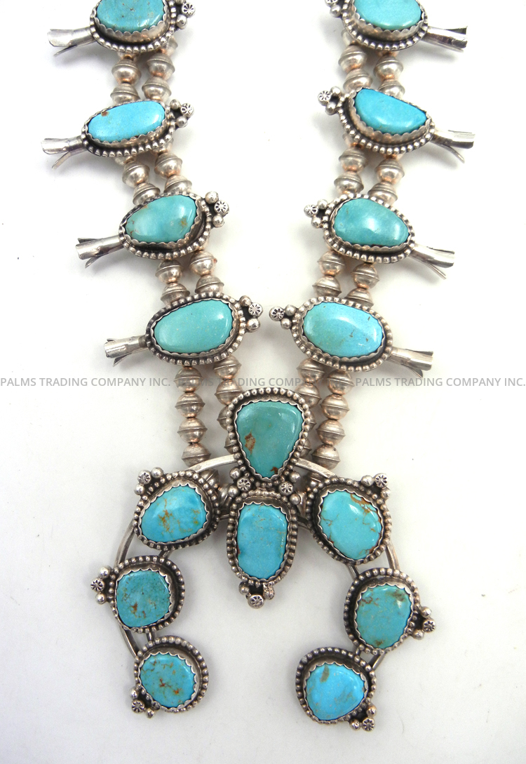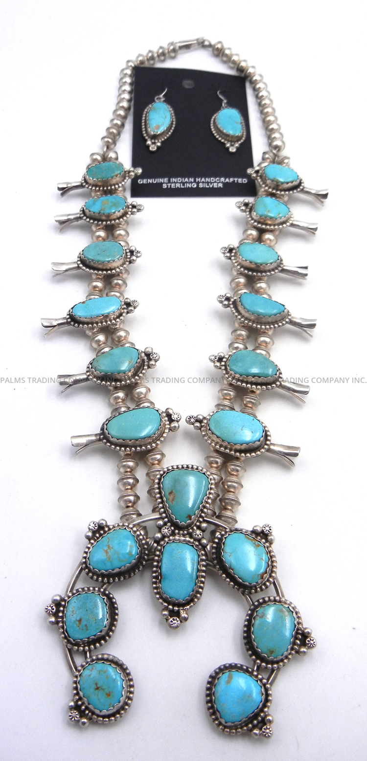Navajo Fannie Platero Large Turquoise and Sterling Silver Squash Blossom Necklace and Earring Set