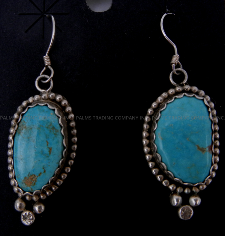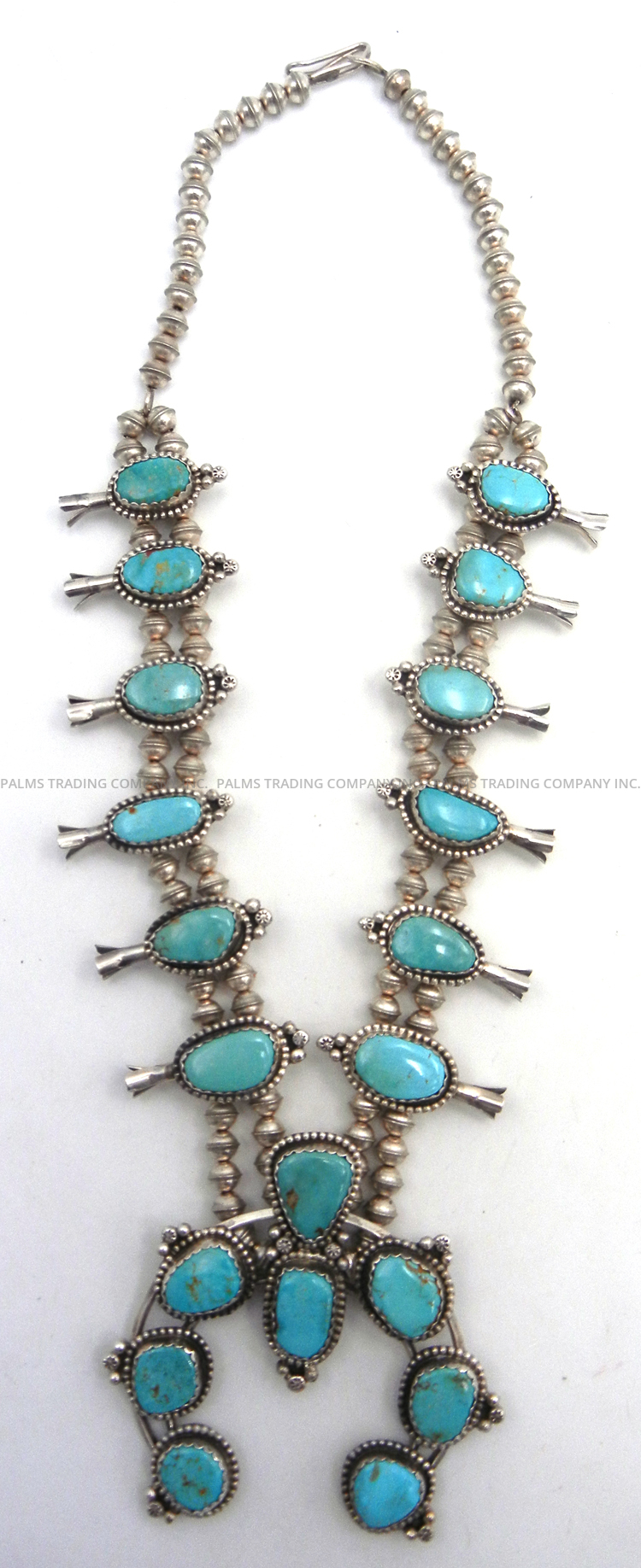 Featuring twenty gorgeous blue-green turquoise stones along both naja and beaded strands of Navajo pearls, this stunning squash blossom necklace is accompanied by a matching pair of earrings and was handmade by Navajo silversmith Fannie Platero.  Eight of the necklace’s twenty turquoise stones are set along the naja, each stone set in a scalloped sterling silver bezel and surrounded at the base by a row of applique sterling dots.  Each stone is finished with a cluster of two sterling dots and one sterling star pattern, and all stones are set along base comprising thin, split sterling silver bands.  Six turquoise pieces each are set along both sides of the necklace’s sterling silver beaded (Navajo pearl) strands, these turquoise stones also set in scalloped sterling silver bezels, surrounded by applique sterling dots and finished with the same clusters apparent along the naja, but also feature the recognizable three pronged sterling blossom.  The necklace’s double strands merge into a single strand toward the top, where it is finished with a hook and eye closure.  Matching earrings mimic the stones along the necklace’s naja.  Necklace measures 24 1/2″ from end to end, not including naja length.  Naja measures 3 1/4″ long x 3 1/4″ wide.  Total necklace length including naja length is 27 3/4.” Earrings measure 1 7/8″ long including French hook x 3/4″ wide.
