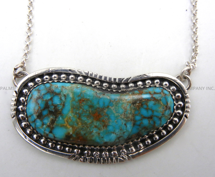 A single, beautiful piece of blue-green turquoise containing large portions of brown and tan matrix is attached to a thin sterling silver chain on each end to form this fun, more contemporary necklace by Navajo silversmith Ted Secatero. The stone is set in a sawtooth sterling silver bezel surrounded at the base by a row of applique sterling dots, followed by a thin sterling band stamped with fine lines on all four sides. Necklace measures 18 1/2″ from end to end and is finished with a lobster claw clasp. Turquoise piece measures 1 3/4″ long x 7/8″ wide.