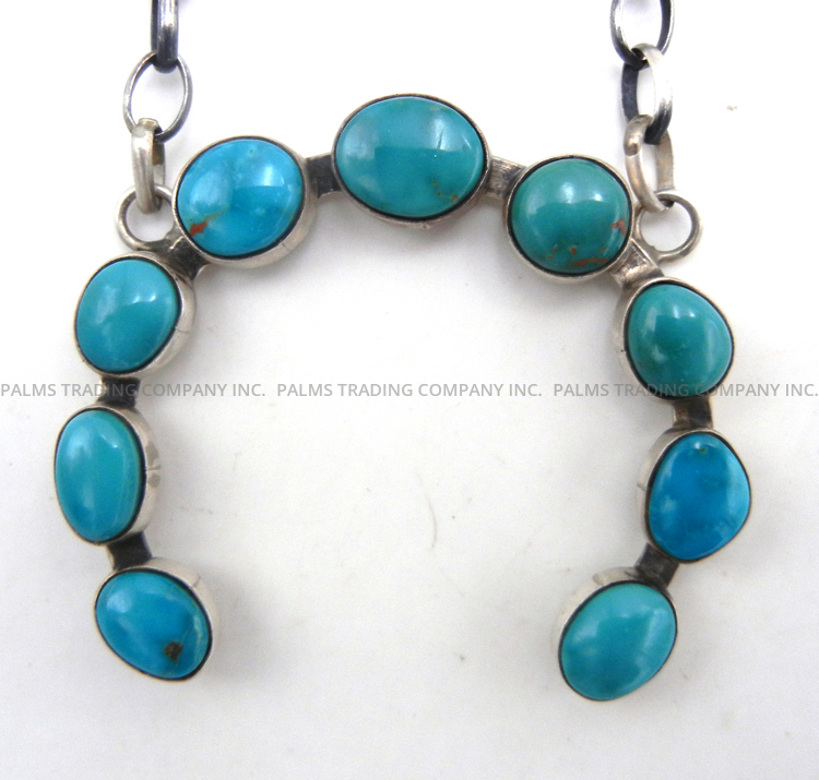 Nine oval pieces of vibrant turquoise set in simple sterling silver bezels form a traditional naja connected to a handmade sterling silver chain in this traditional Navajo necklace.  Each stone contains small portions of brown matrix.  Chain is finished with a lobster claw clasp.  Naja measures 1 3/4″ long x 2″ wide.  Necklace measures 20″ from end to end not including naja length. Total length is 21 3/4″.