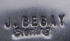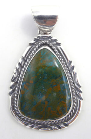 A rounded triangular green turquoise stone creates the focal point of this traditional Navajo pendant. The stone is set in a simple sterling silver bezel and contains large portions of tan matrix running throughout. It is surrounded at the base by a sterling rope pattern, followed by a sterling band stamped to form a reoccurring pattern. 2″ long including bail x 1 1/4″ wide.